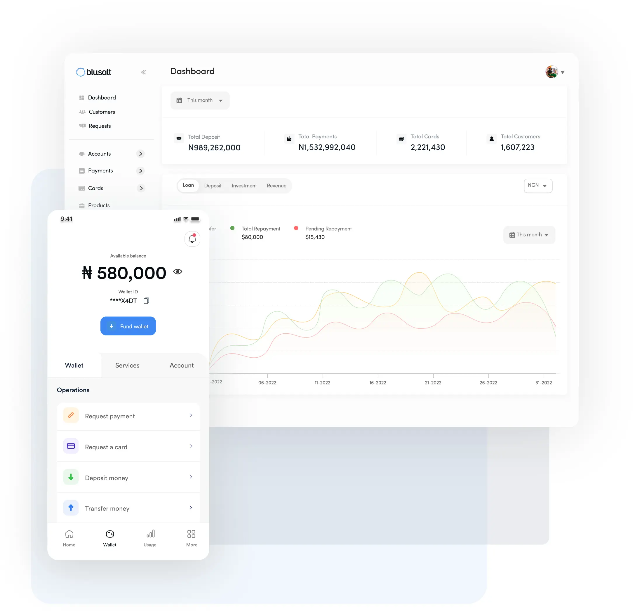 Blusalt banking-as-a-service API allows you to build seamless banking products and embed a complete suite of financial services in your marketplace or platform. With a single integration that enables your customers to have bank accounts, hold funds, deposit and withdrawals funds, pay bills, and manage cash flow.